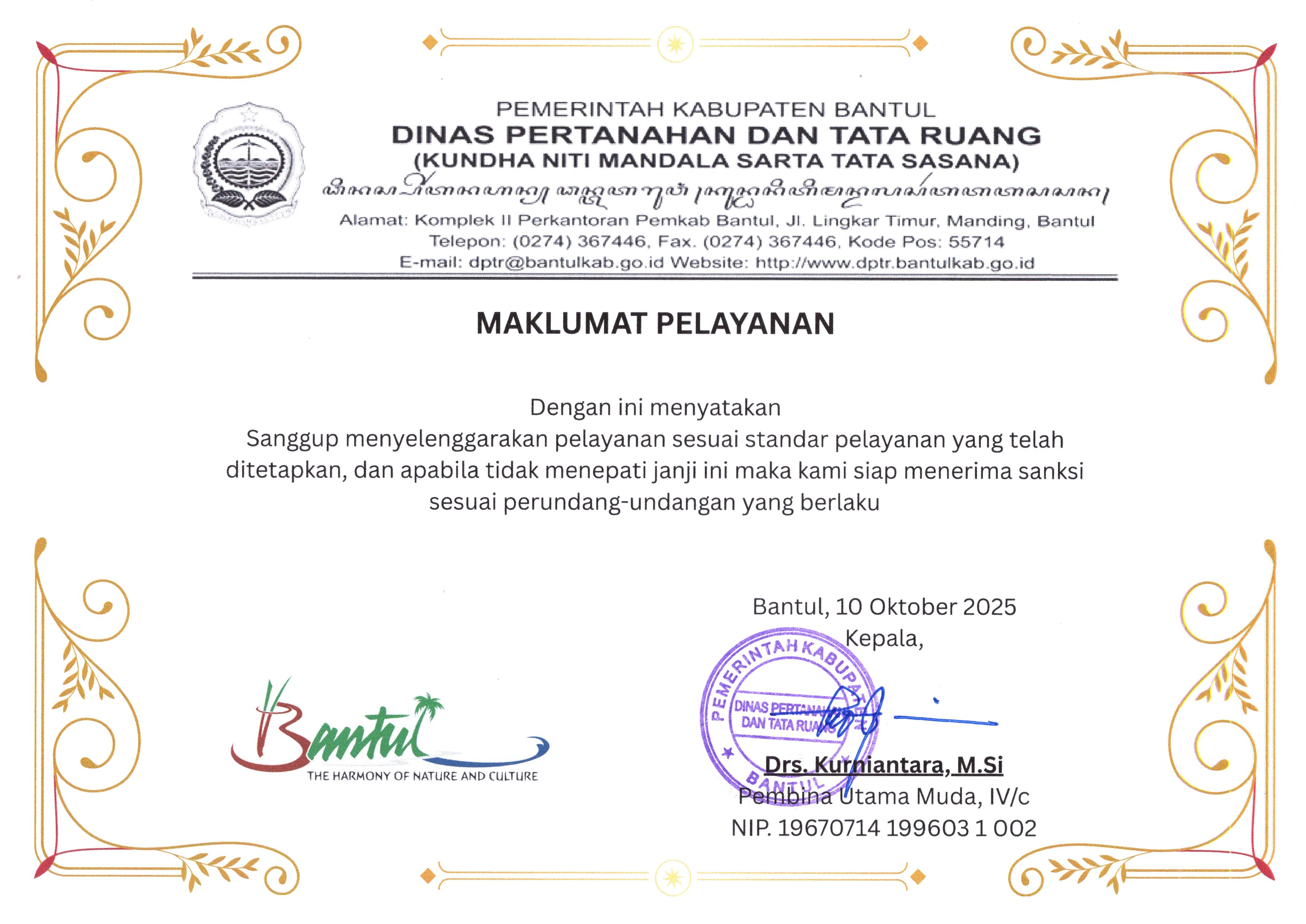 Surat Keputusan Kepala Dinas Pertanahan dan Tata Ruang Kabupaten Bantul Nomor 60/DPTR/V2024 Tentang Standar Pelayanan di Dinas Pertanahan dan Tata Ruang Kabupaten Bantul